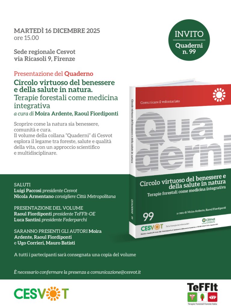 A queste domande prova a rispondere il volume “Circolo Virtuoso del Benessere e della Salute in Natura. Terapie forestali come medicina integrativa”, che sarà presentato martedì 16 dicembre 2025 alle ore 15.00, presso la sede regionale Cesvot, via Ricasoli 9, Firenze.